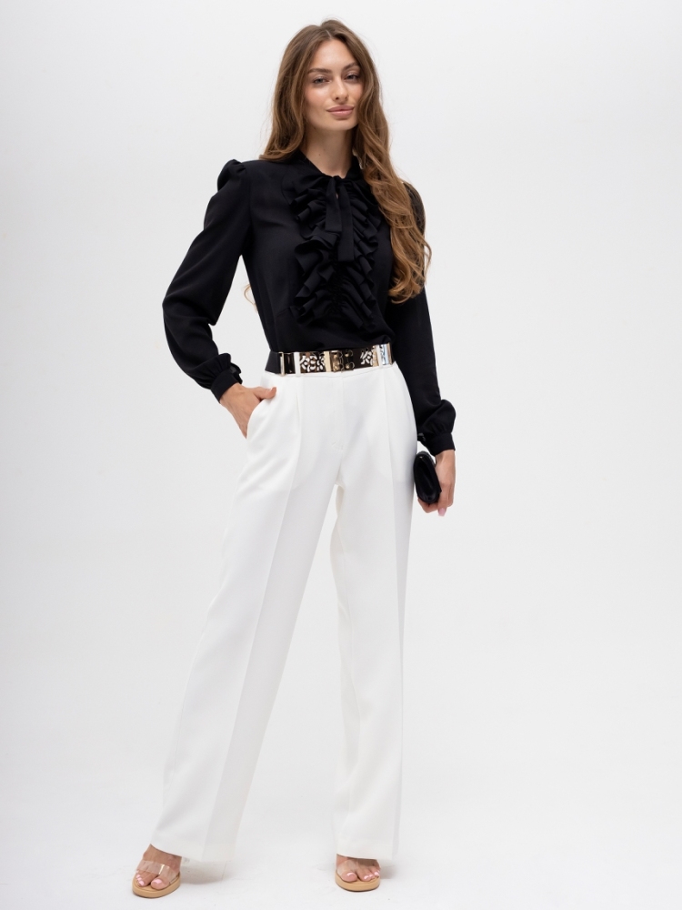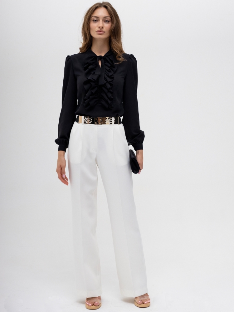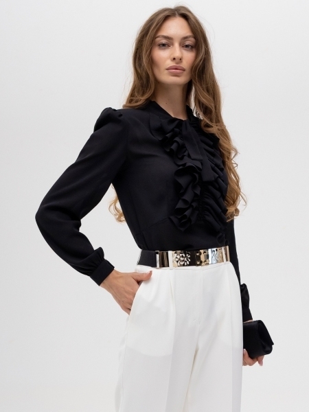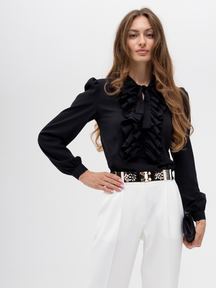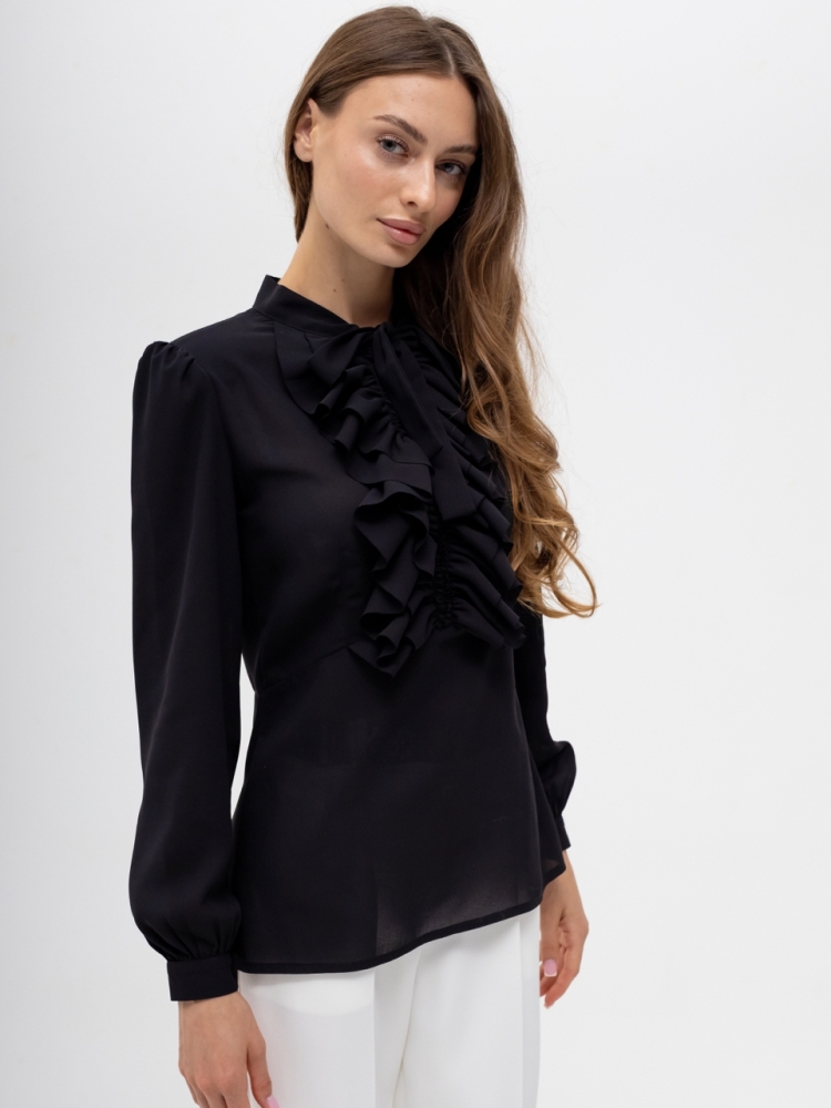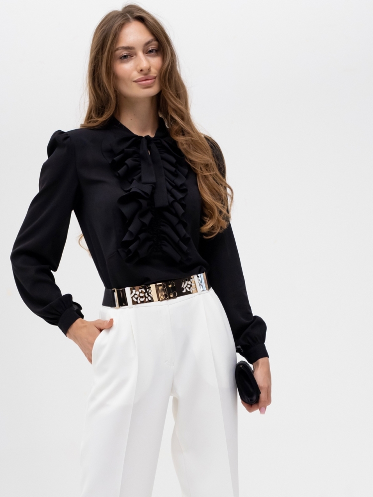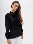 Элегантная блуза от бренда Нефертити выполнена из блузочного крепа высочайшего качества. Детали: модель свободного кроя, на подплечниках. На полочке предусмотрены нагрудные вытачки для лучшей посадки по фигуре. Рукава длинные на манжетах, застегиваются на пуговицу. Перед блузки оформлен красивыми воланами и завязкой на воротнике полустойке. Без карманов. Рост девушки-модели - 170см., размер - 42.