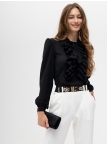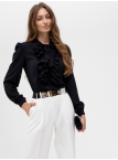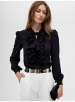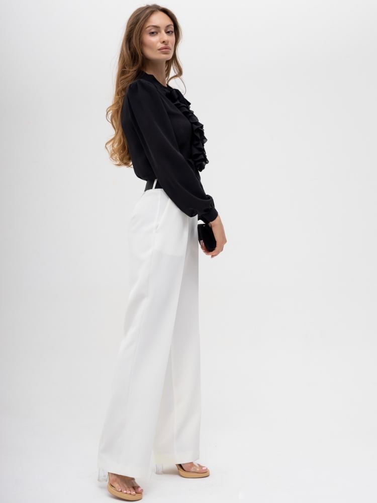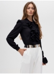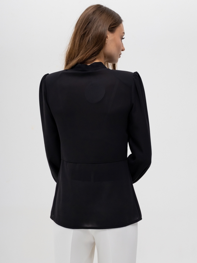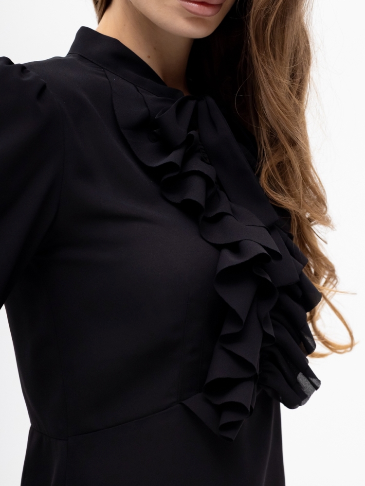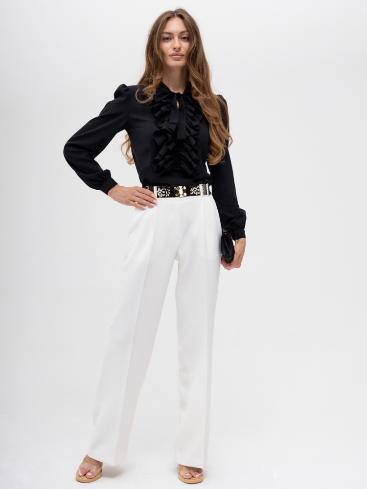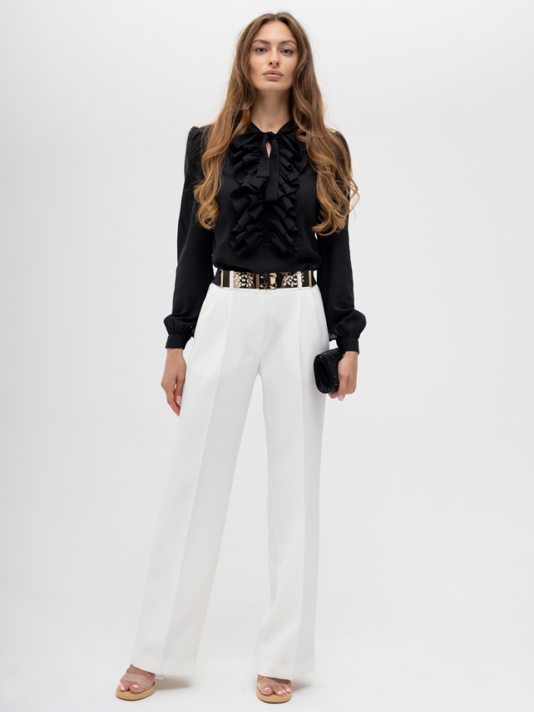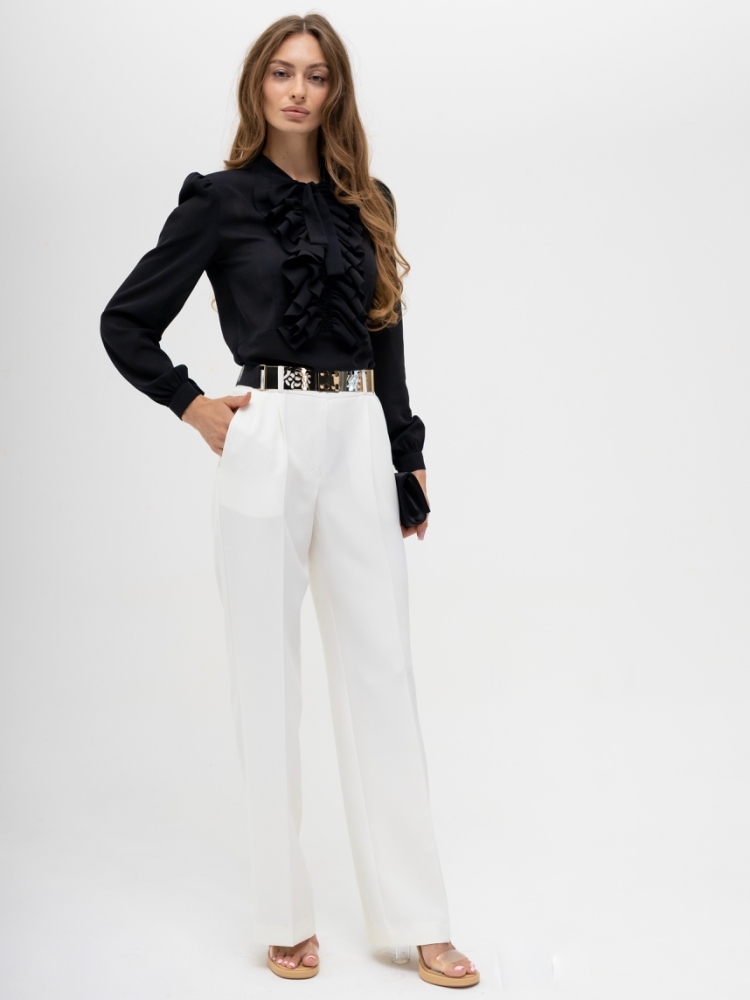 Элегантная блуза от бренда Нефертити выполнена из блузочного крепа высочайшего качества. Детали: модель свободного кроя, на подплечниках. На полочке предусмотрены нагрудные вытачки для лучшей посадки по фигуре. Рукава длинные на манжетах, застегиваются на пуговицу. Перед блузки оформлен красивыми воланами и завязкой на воротнике полустойке. Без карманов. Рост девушки-модели - 170см., размер - 42.