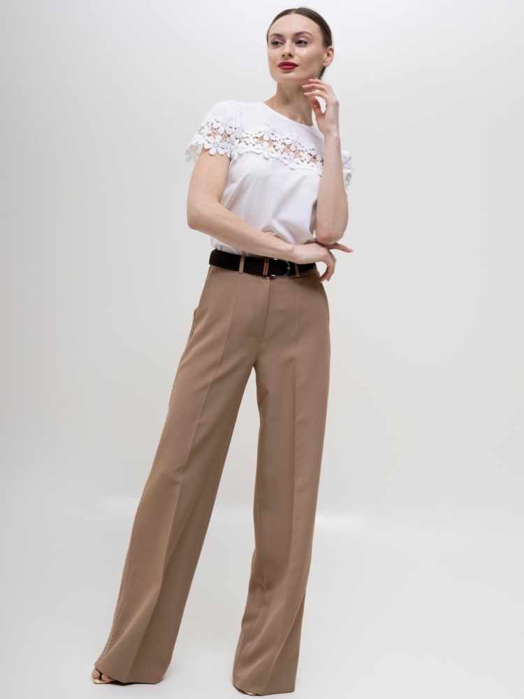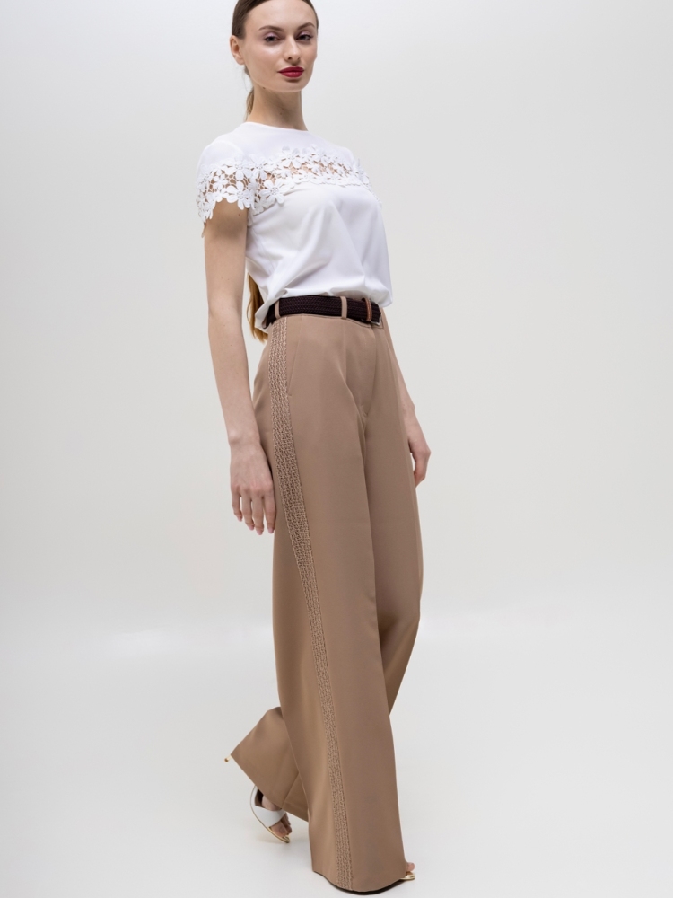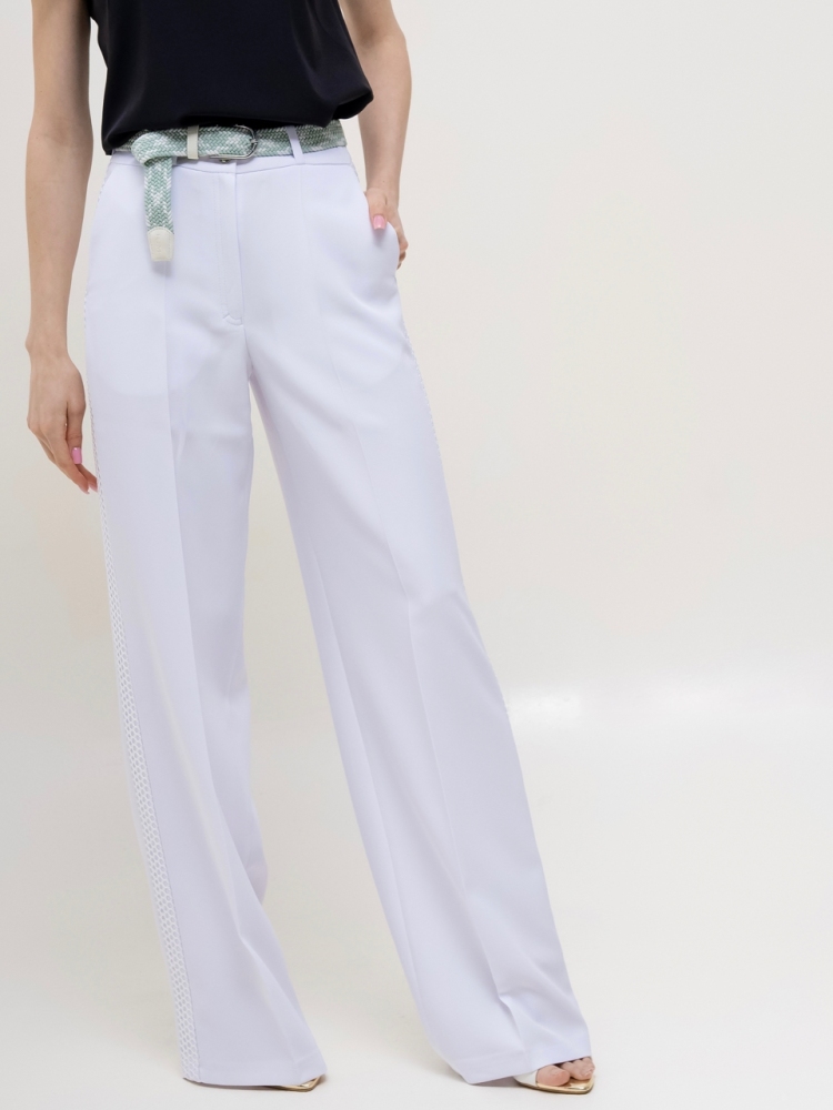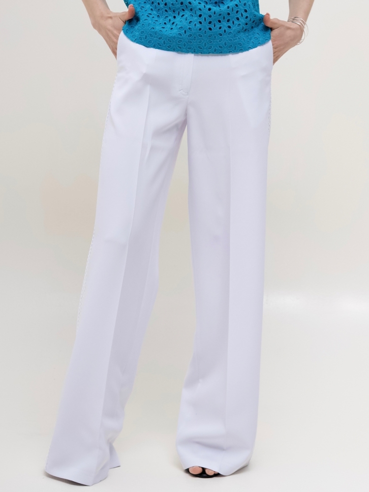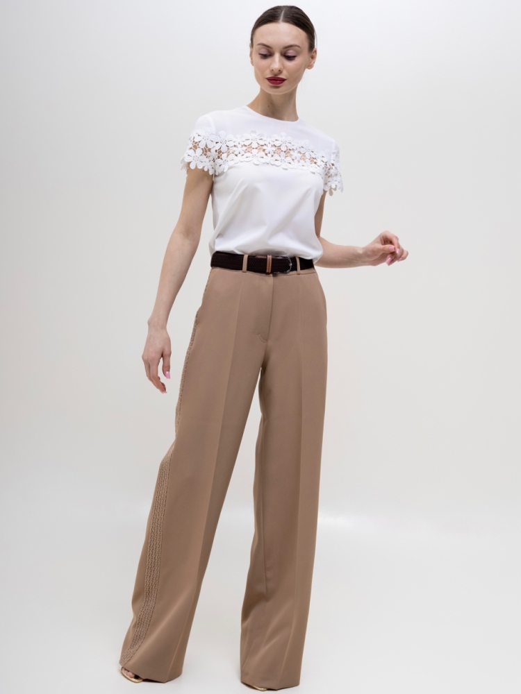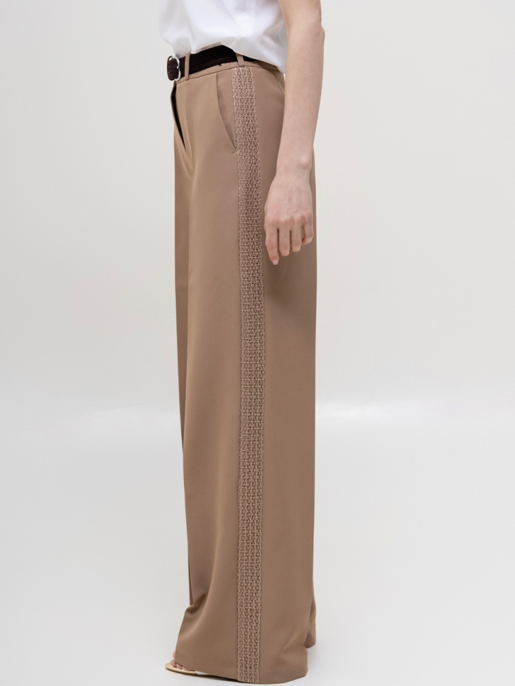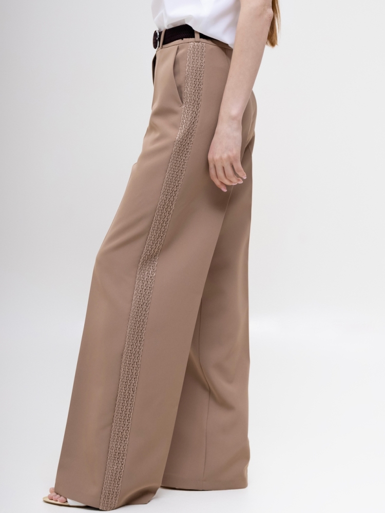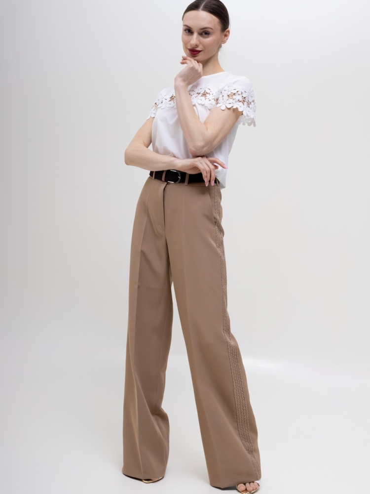 Трендовые широкие брюки с лампасами, выполнены из мягкой костюмной стрейчевой ткани "Барби". Детали: модель брюк - широкие, по всей длине брюк заутюжены стрелки. Посадка - на талии. Шлевки для ремня на притачном поясе. По бокам - карманы с отрезным бочком. По всей длине брюк по боку имеется широкий лампас из красивого кружева. Рост девушки-модели - 170 см., размер - 42.