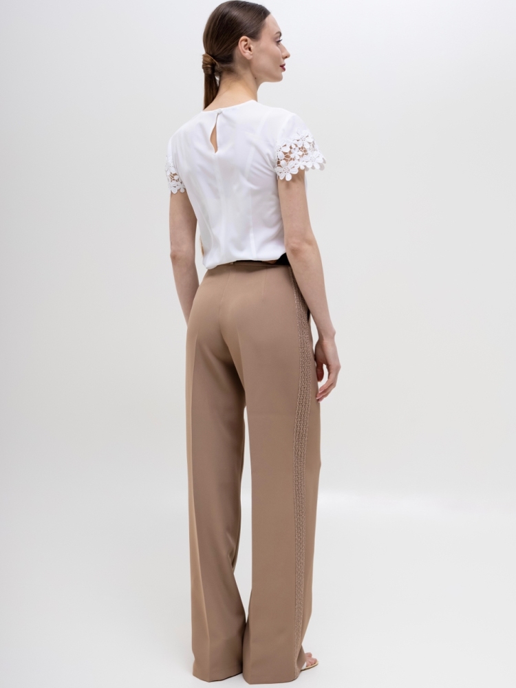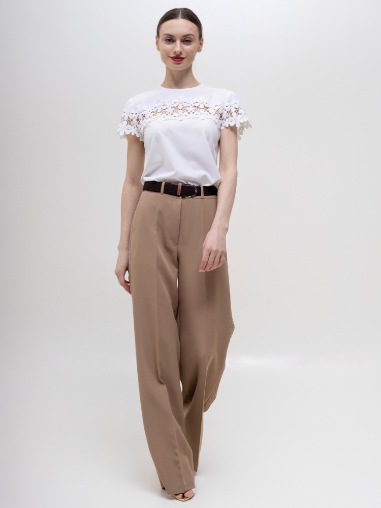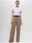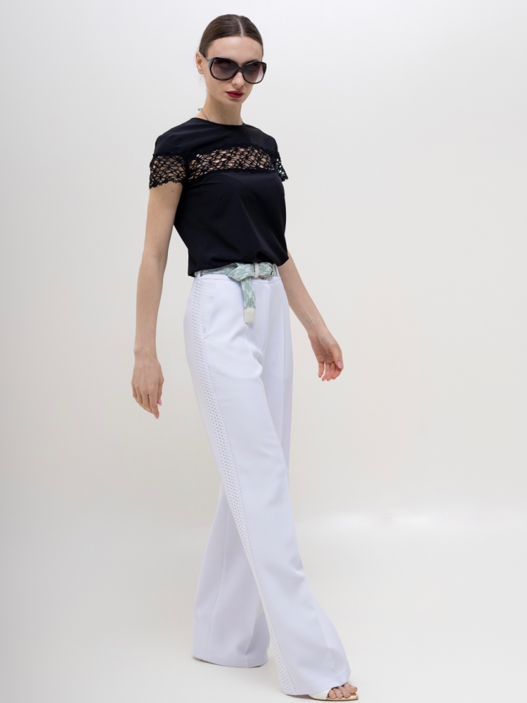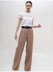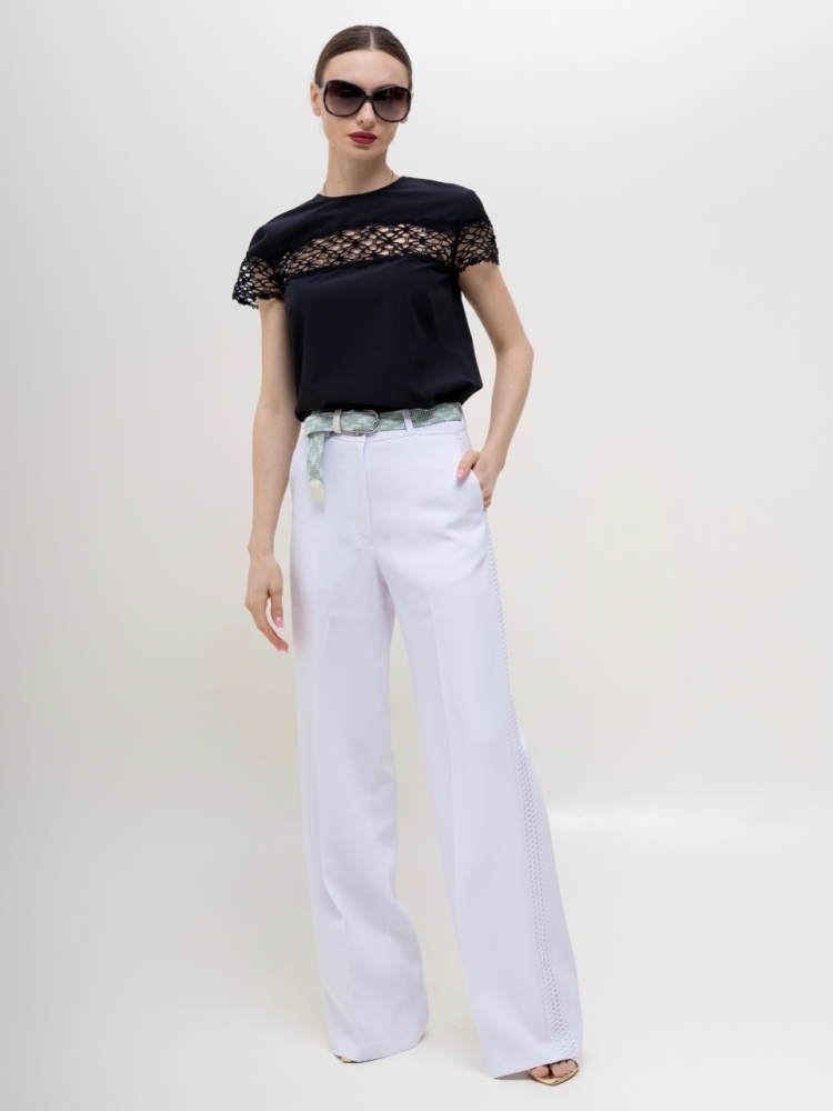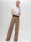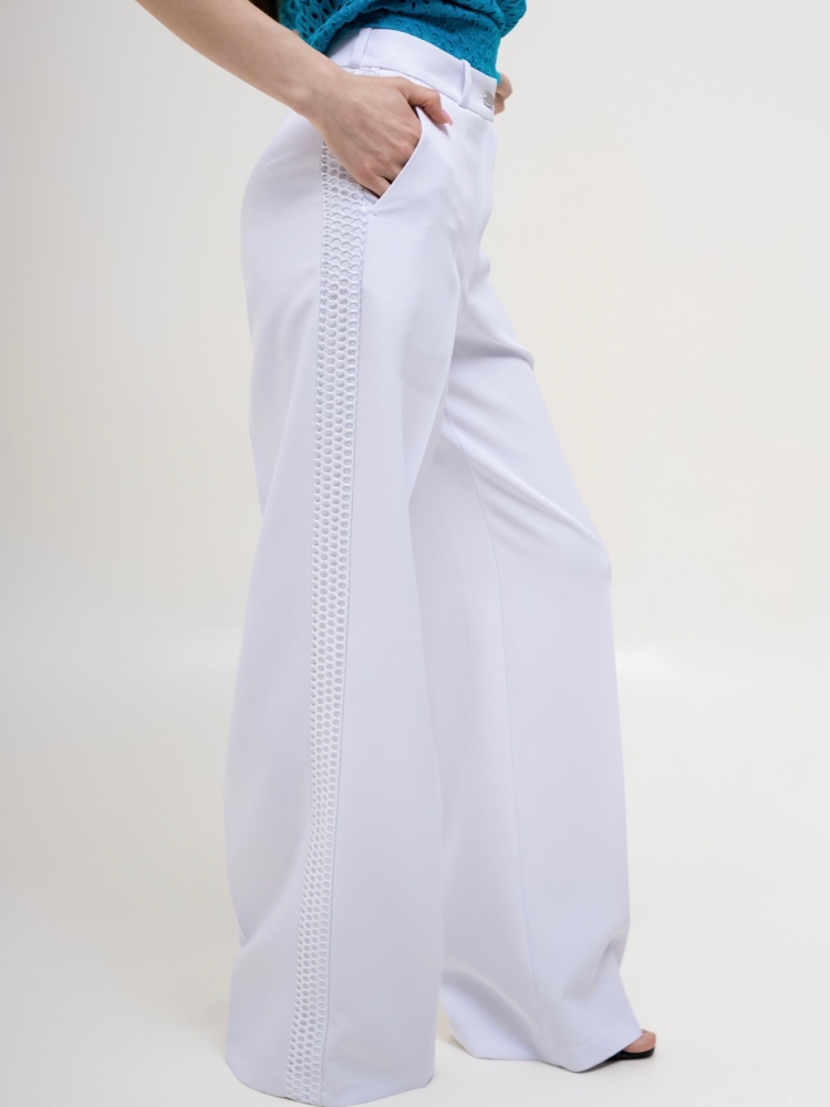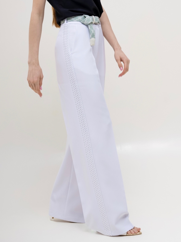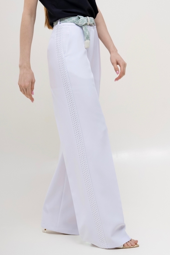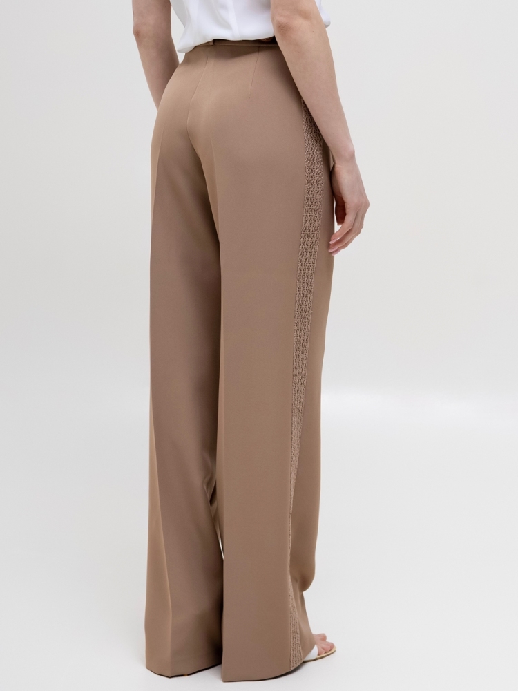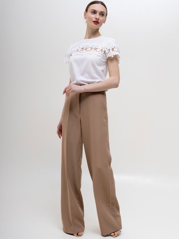 Трендовые широкие брюки с лампасами, выполнены из мягкой костюмной стрейчевой ткани "Барби". Детали: модель брюк - широкие, по всей длине брюк заутюжены стрелки. Посадка - на талии. Шлевки для ремня на притачном поясе. По бокам - карманы с отрезным бочком. По всей длине брюк по боку имеется широкий лампас из красивого кружева. Рост девушки-модели - 170 см., размер - 42.