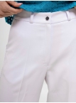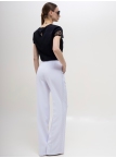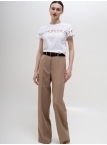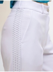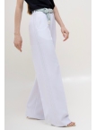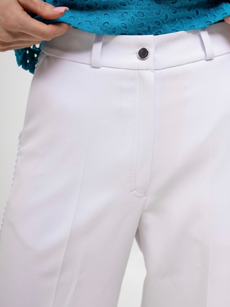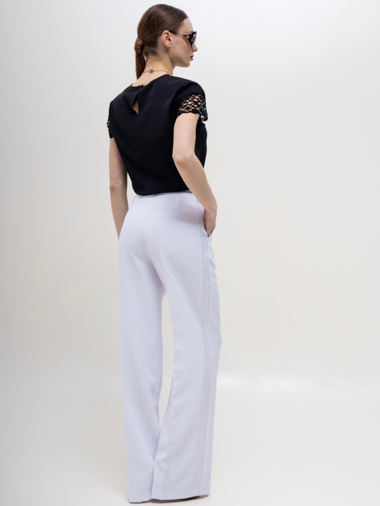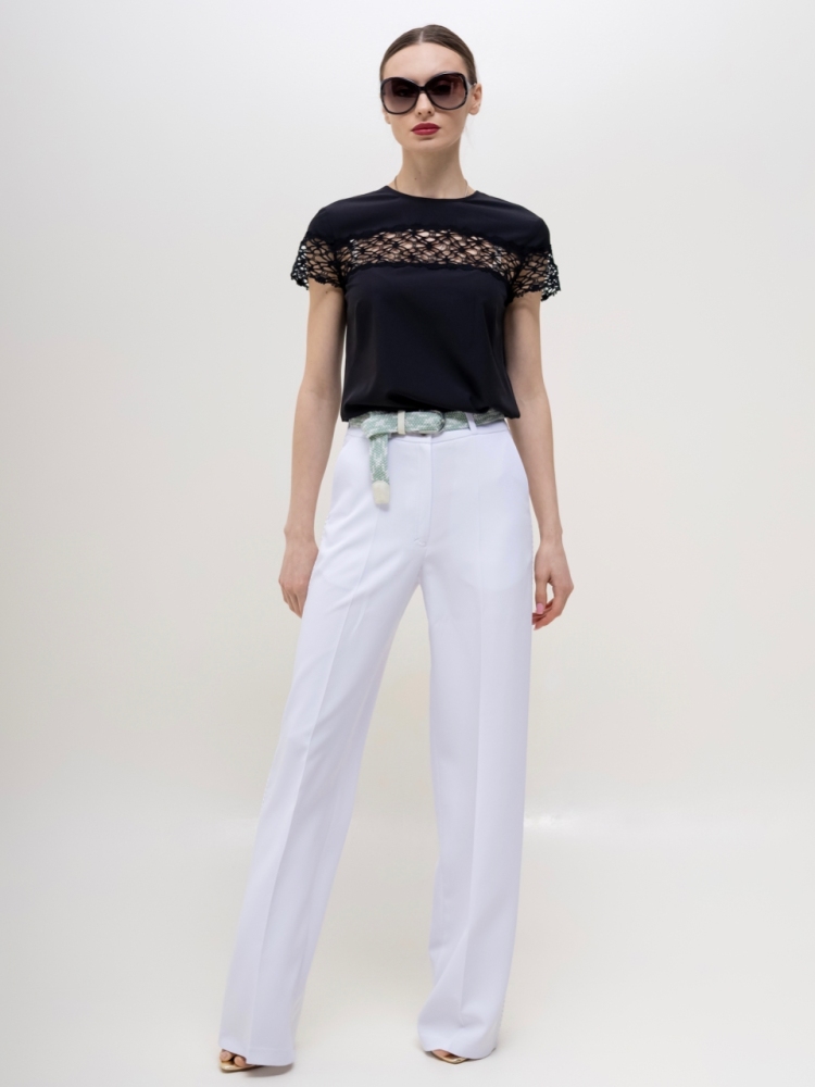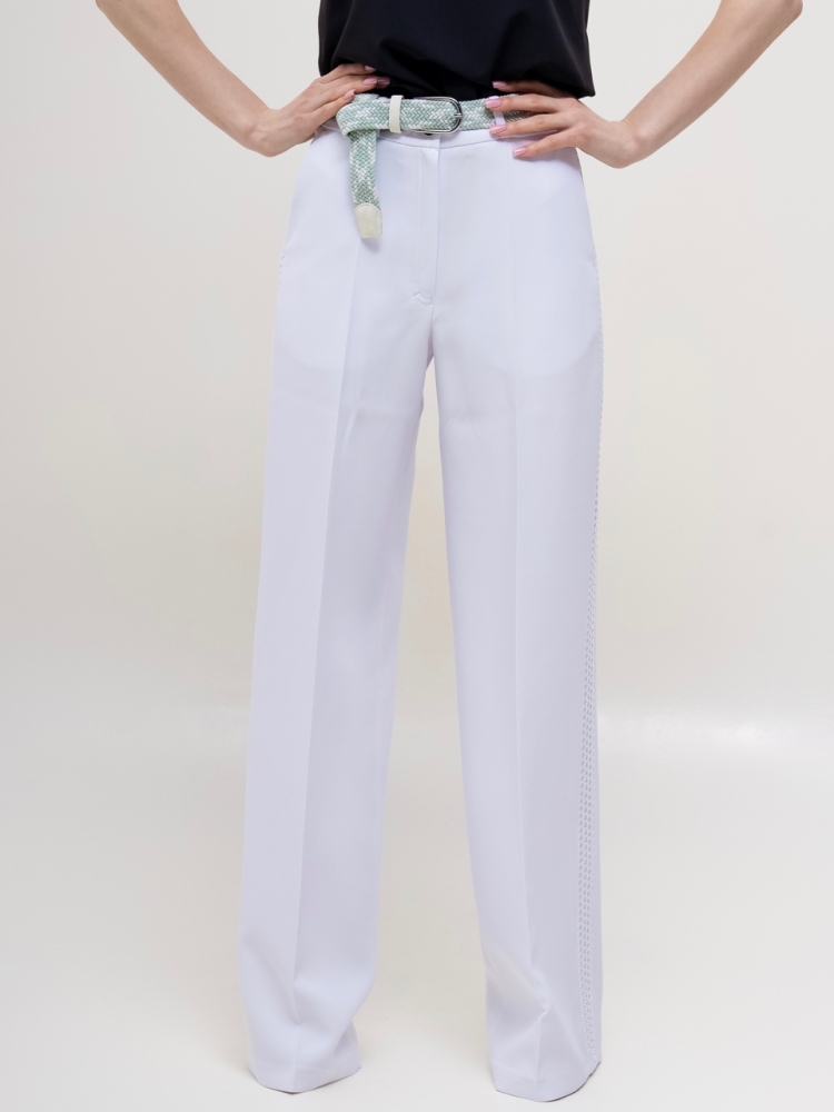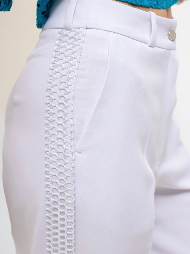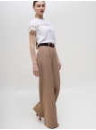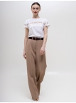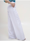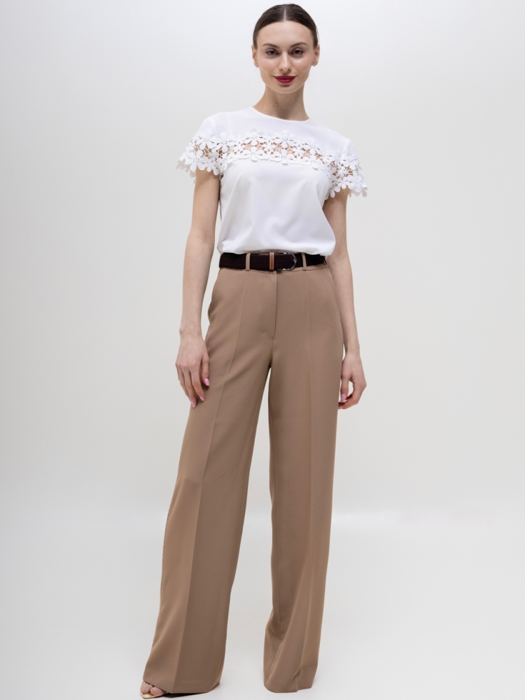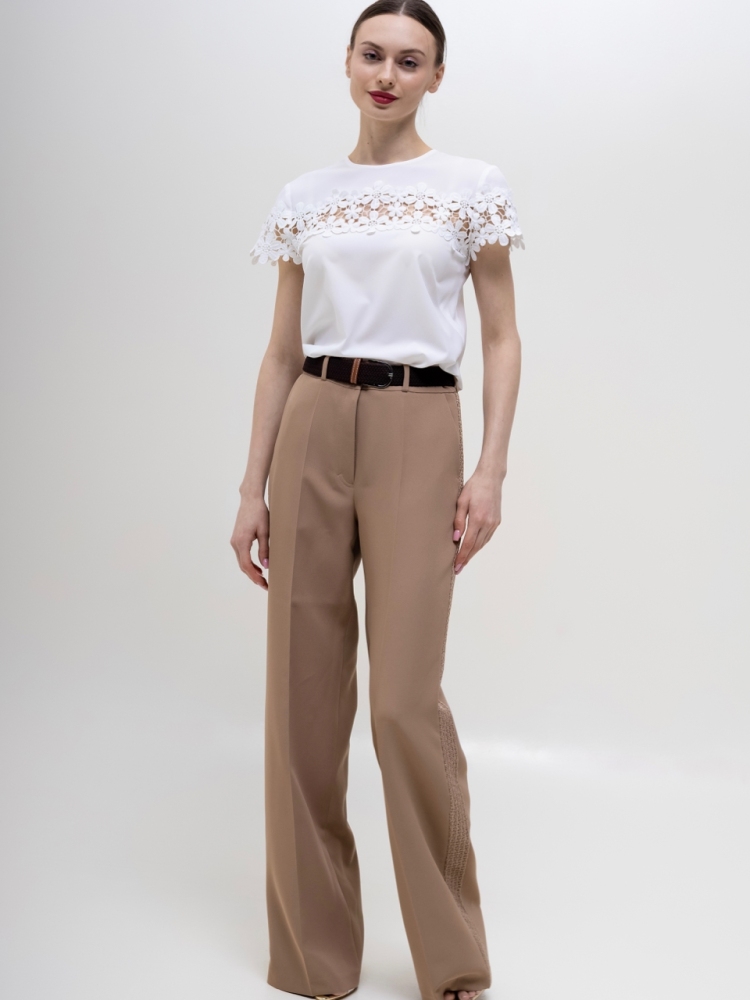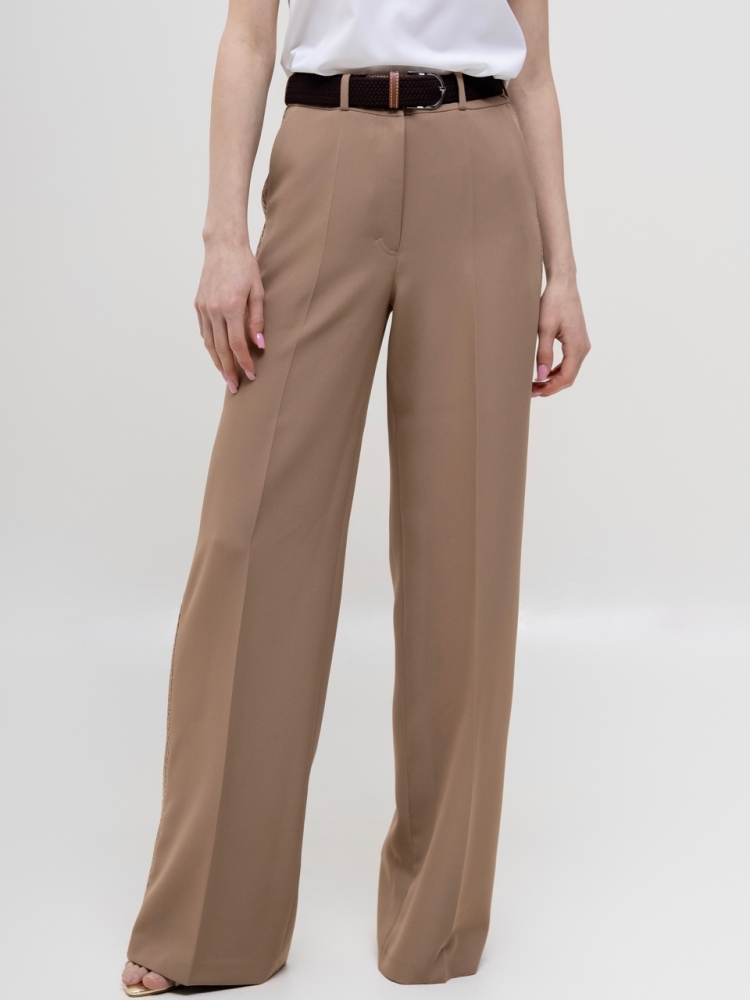 Трендовые широкие брюки с лампасами, выполнены из мягкой костюмной стрейчевой ткани "Барби". Детали: модель брюк - широкие, по всей длине брюк заутюжены стрелки. Посадка - на талии. Шлевки для ремня на притачном поясе. По бокам - карманы с отрезным бочком. По всей длине брюк по боку имеется широкий лампас из красивого кружева. Рост девушки-модели - 170 см., размер - 42.