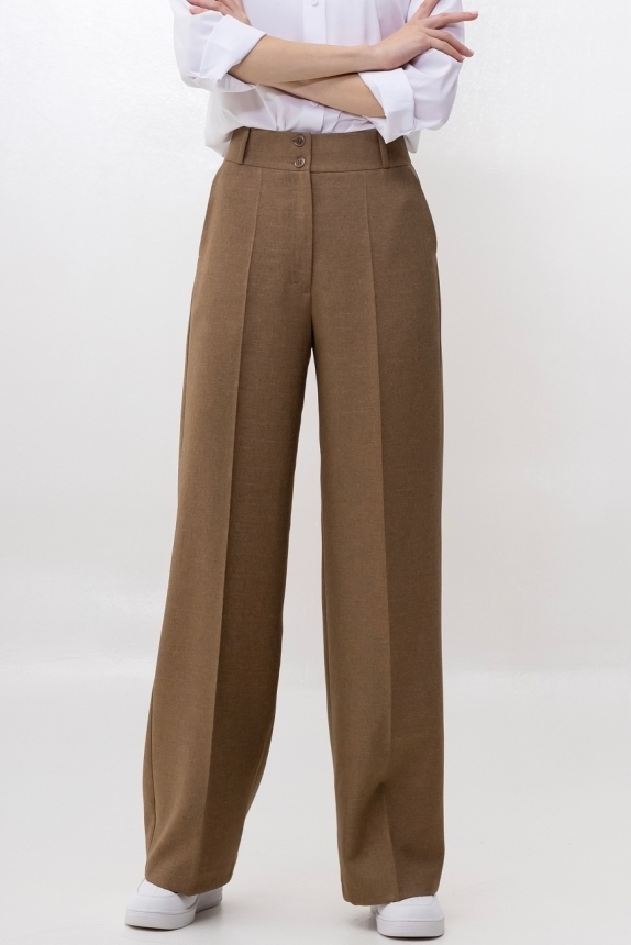 Трендовые широкие брюки в красивом цвете, выполнены из качественной итальянской костюмной ткани. Детали: модель брюк - широкие, по всей длине брюк заутюжены стрелки. Посадка - на талии. Шлевки для ремня на притачном поясе. По бокам - карманы с отрезным бочком. Рост девушки-модели - 175 см., размер - 42. К этим брюкам в нашем магазине представлен жакет (артикул 00493/1), вместе с которым получится идеальный комплект.