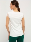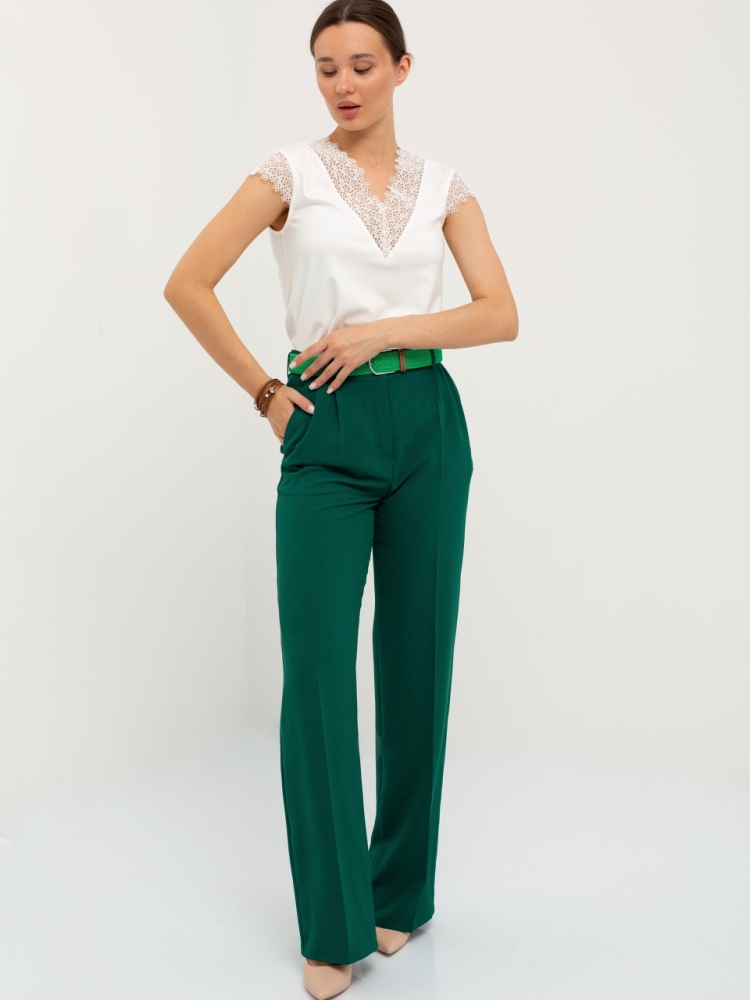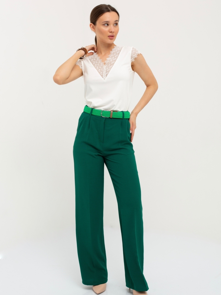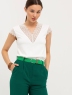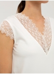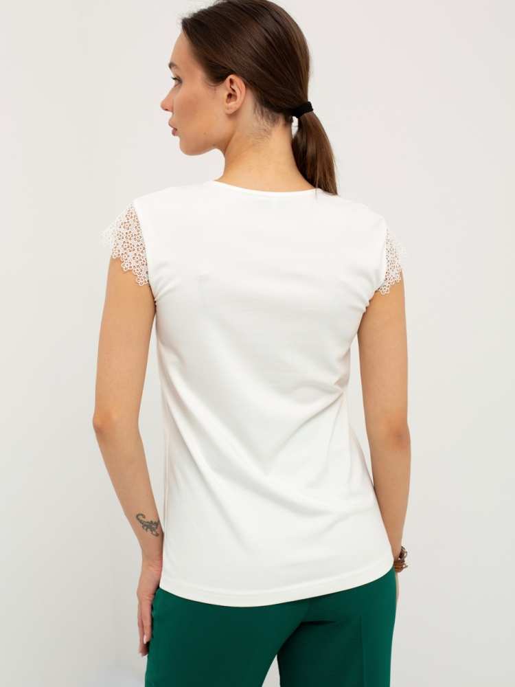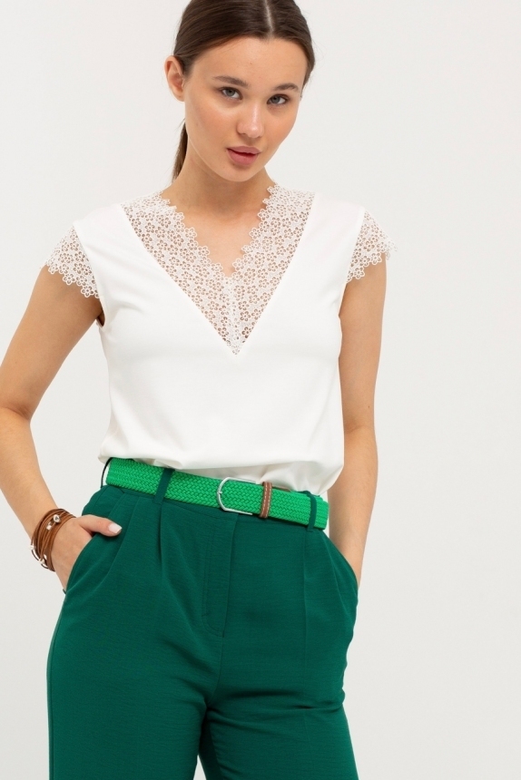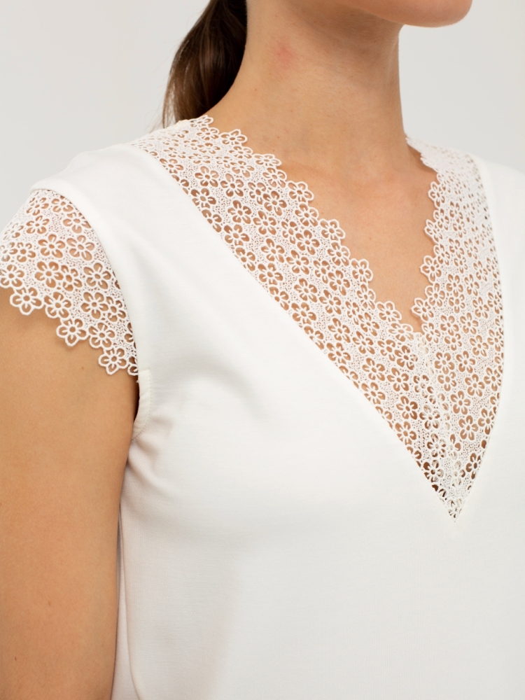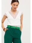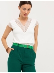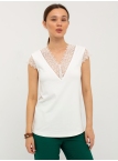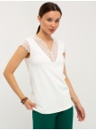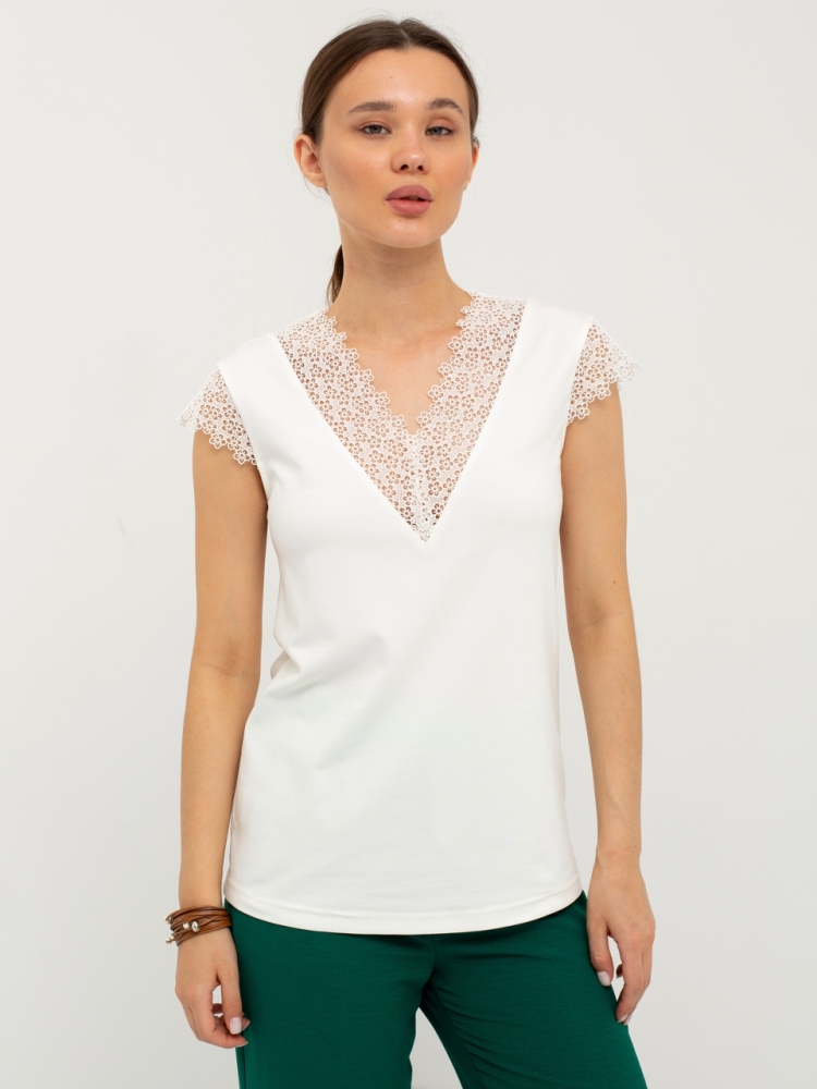 Блуза выполнена из трикотажной вискозы высочайшего качества в сочетании с нежным кружевом. Детали: модель без рукавов, прямого силуэта с V-образным вырезом горловины, декорированным красивым кружевом. Рост девушки-модели - 170см. Размер-42.