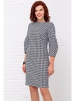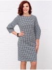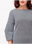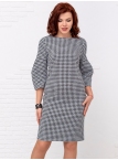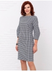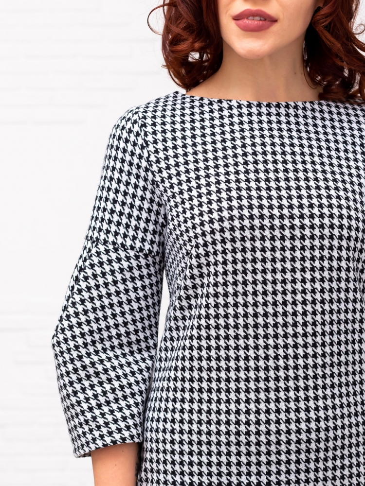 Это великолепное платье в расцветке "куриная лапка" стиля "Джеки Кеннеди" ни кого не оставит равнодушным. Детали: модель выполнена из мягкого, держащего форму трикотажа джерси. Вырез горловины округлый. Рукава втачные длиной 3/4 оригинальной формы. Силуэт прямой, По полочке и спинке имеются вытачки. Потайная застежка "молния" и шлица по спинке. Без карманов. Без подкладки. Рост девушки модели - 173 см.