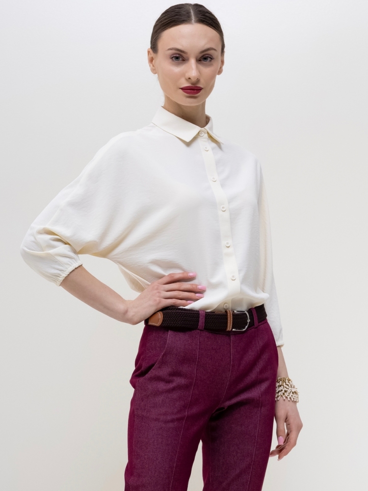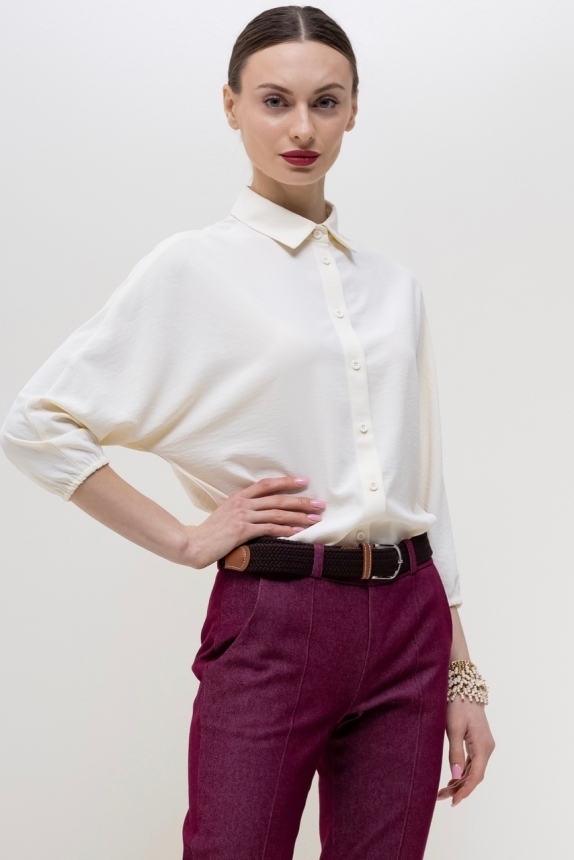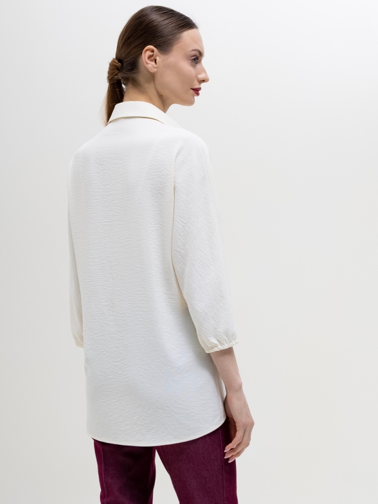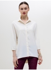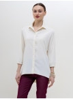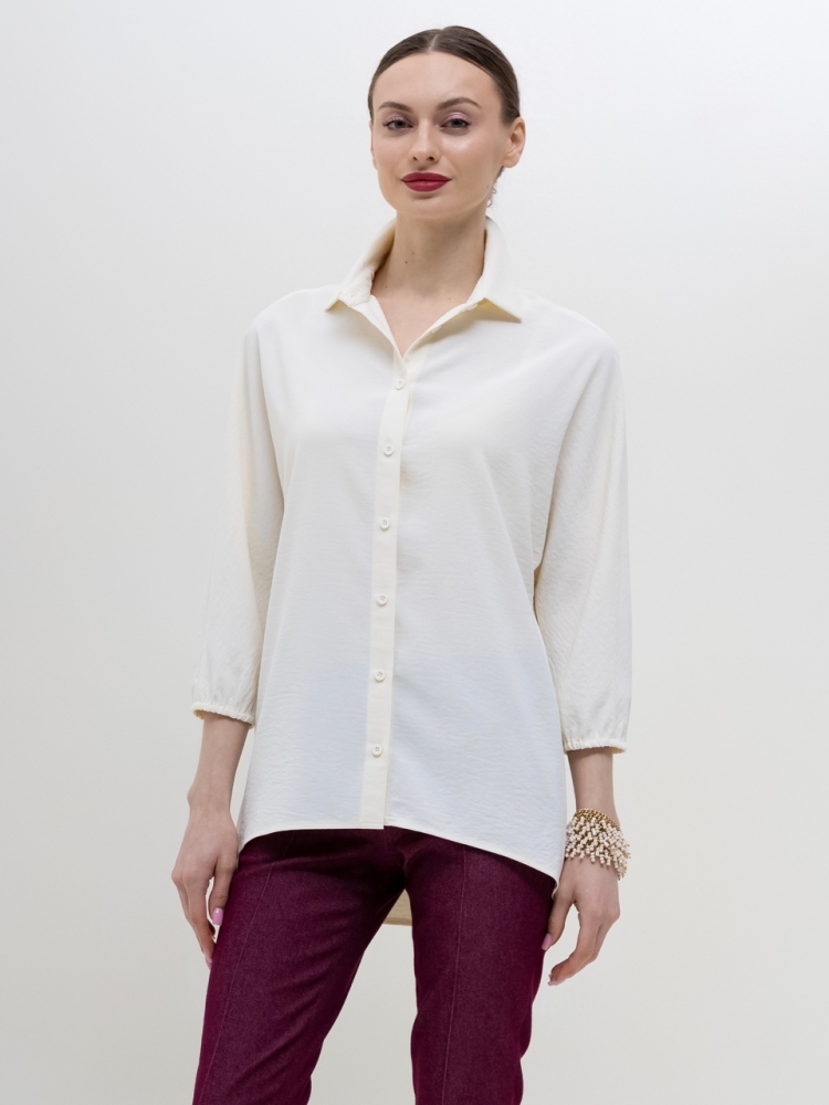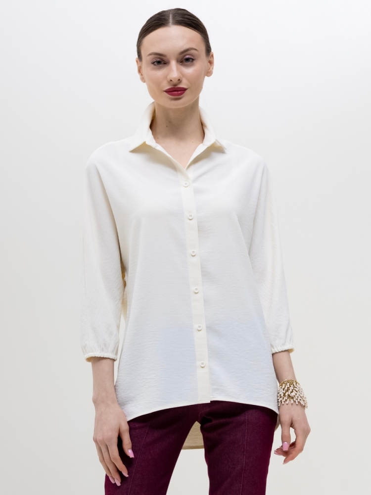 Базовая блуза-рубашка - неотъемлемый атрибут современной женщины, а, если это еще и немнущаяся ткань вискоза жатка, то это просто находка для любого путешествия или командировки. Детали: модель свободного кроя с асимметричным низом - полочка блузы слегка укорочена, а спинка удлинена в форме легкого овала, что позволяет носить эту рубашку как на выпуск с брюками, так и в заправку с юбками или брюками. Аккуратный классический отложной воротничек. По переду планка с застежкой на пуговицы. Рукава "летучая мышь", длиной 3/4, зафиксированы на аккуратную резиночку. Модель без карманов. Рост девушки-модели - 170см., размер - 42.