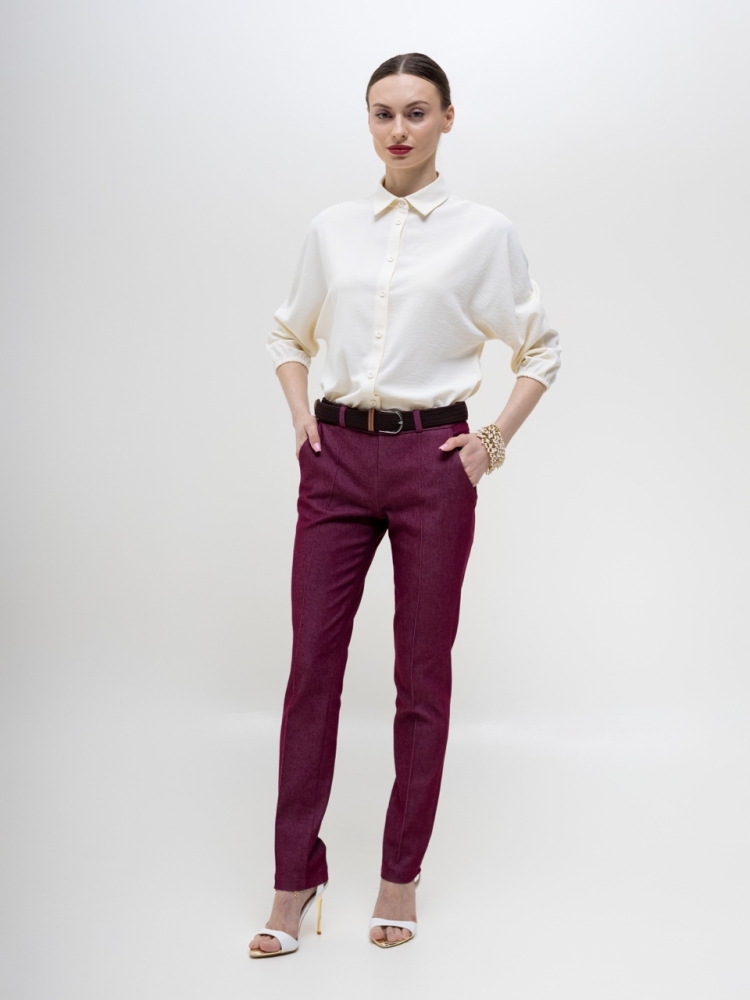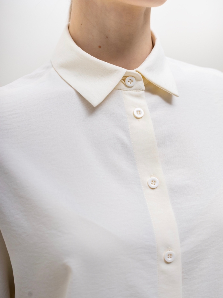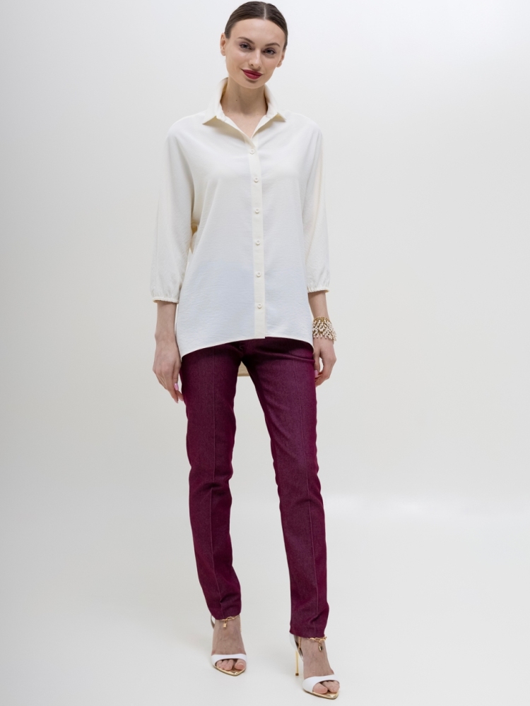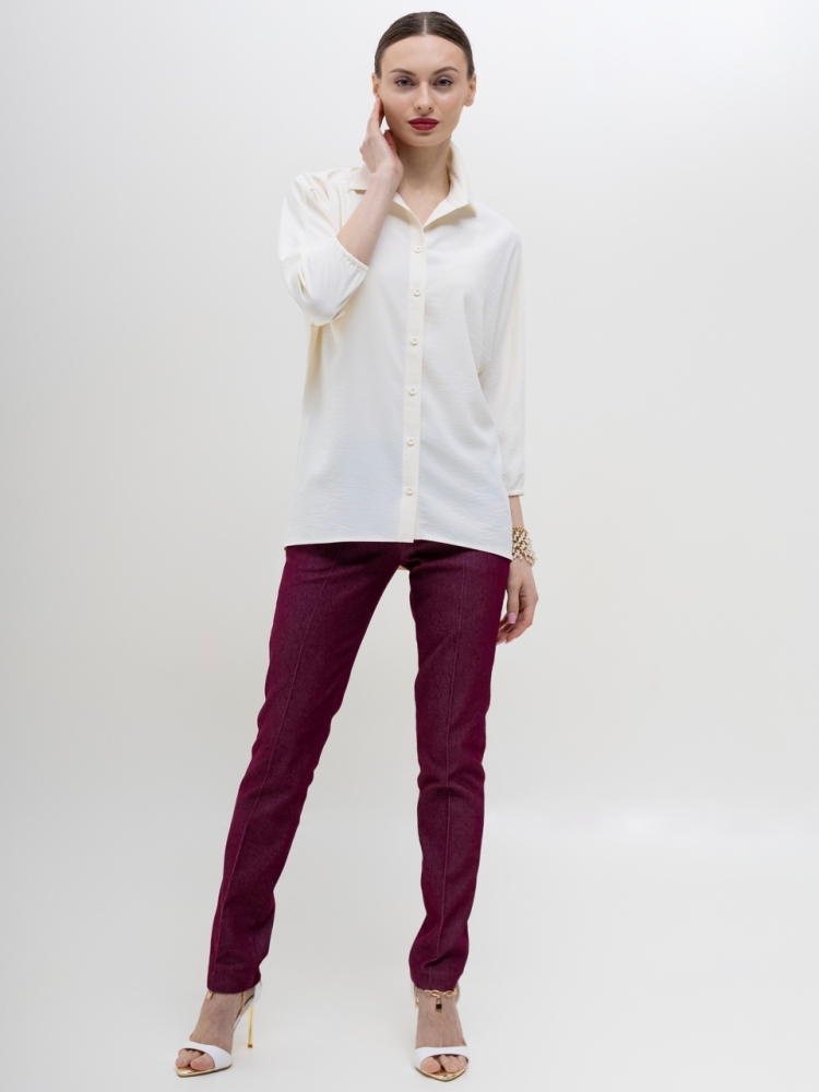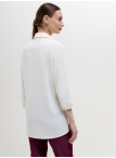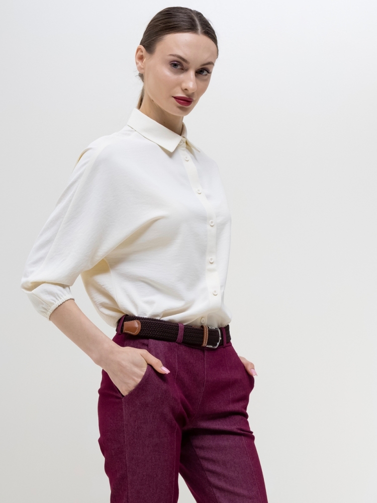 Базовая блуза-рубашка - неотъемлемый атрибут современной женщины, а, если это еще и немнущаяся ткань вискоза жатка, то это просто находка для любого путешествия или командировки. Детали: модель свободного кроя с асимметричным низом - полочка блузы слегка укорочена, а спинка удлинена в форме легкого овала, что позволяет носить эту рубашку как на выпуск с брюками, так и в заправку с юбками или брюками. Аккуратный классический отложной воротничек. По переду планка с застежкой на пуговицы. Рукава "летучая мышь", длиной 3/4, зафиксированы на аккуратную резиночку. Модель без карманов. Рост девушки-модели - 170см., размер - 42.